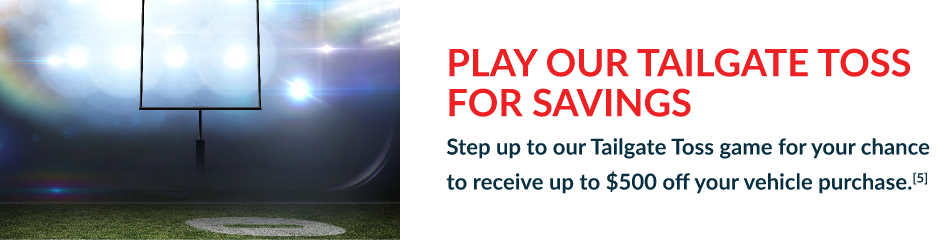 [1] Samsung - 65" Class U7900 Series UHD 4K Smart Tizen TV yours with vehicle purchase from any dealership in the West Hills Autoplex family of dealers, while supplies last. See dealer for details. No cash value will be awarded in lieu of Samsung - 65" Class U7900 Series UHD 4K Smart Tizen TV Retail value of $399.99. All offers expire on 2/8/2026. [2] Enter to win at participating dealership - (7) customers have an opportunity to win a YETI Tundra 45 Cooler. Retail value of $350.00. One person per entry. No purchase necessary. Participants must be 18 years of age with a valid ID and/or Washington State driver license. Odds of winning YETI Tundra 45 Cooler is based on the number of entrants. Drawing will be held on 2/9/2026. Winner need not be present to win. Winner will be selected at random and be notified by Haselwood Automotive Group Marketing Department. Winner will need to respond to Haselwood Automotive Group Marketing Department at 360-473-1350 by 2/20/2026. No cash value will be awarded in lieu of the YETI Tundra 45 Cooler. By filling out this form, you consent to the use and distribution of your name, image, and likeness in any and all media for lawful business purposes, without limitation or compensation. You waive any right to approve or revoke such use, and release all claims arising from the use of your name, image, and likeness as described herein. Employees of the Haselwood Automotive Group and their family members are ineligible to participate. Event is sponsored by the Haselwood Automotive Group 950 West Hills Blvd., Bremerton, WA 98312. See dealers for details. All offers expire on 2/8/2026. [3] Receive a $10 Amazon.com gift card with test drive while supplies last, limit one per customer. All offers expire 2/8/2026. [4] Every customer will receive a complimentary West Hills Autoplex Junior (9.5") Football (MSRP - $14.99), while supplies last, limit one per customer, no purchase necessary. See dealer for details. All offers expire 2/8/2026.[5] "Tailgate Toss" offer will be applied to vehicles purchased from any dealership in the West Hills Autoplex. Receive up to $500 from the dealer towards your vehicle purchase. $500 is in addition to any Manufacturer discounts, incentives, and other programs. Example Vehicle: 2025 Toyota Tacoma SR5 Double Cab. VIN: 3TMKB5FN7SM053314. TSRP $39,084. All vehicle prices plus tax and license. A negotiable documentary service fee in the amount of up to $200 may be added to the sale price or capitalized cost. All offers expire 2/8/2026.